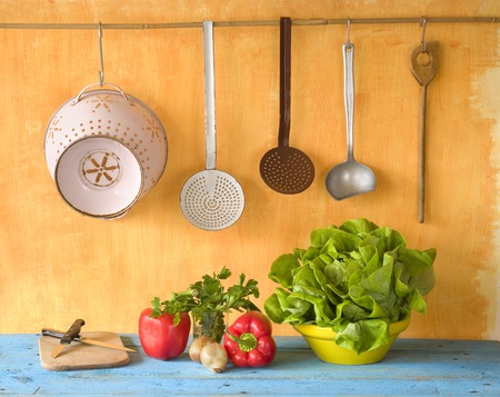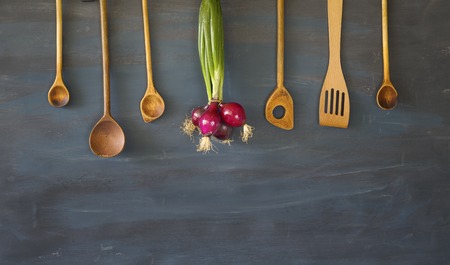 old wooden kitchen utensils and vegetables on rustic kitchen wall, good copy space