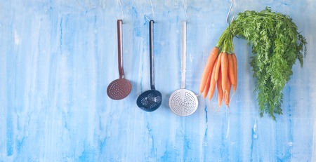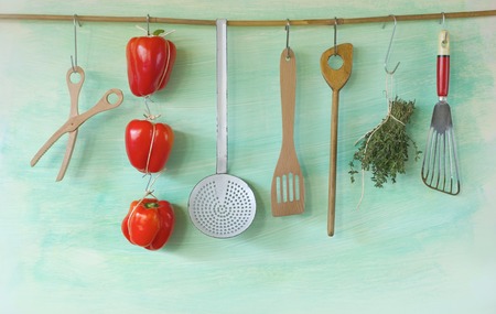 hanging vintage kitchen utensils w. herbs and bell pepper, cooking concept,copy space