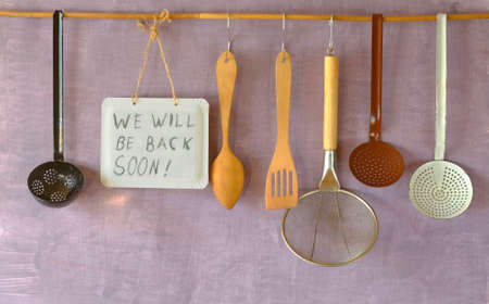 reopen sign, restaurant or cafe ready to service after lockdown, kitchen utensils and message,copy space