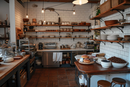 A well-equipped kitchen featuring an ample amount of counter top space, ready for culinary tasks and meal preparation, An inviting bakery kitchen with no activities going on, AI Generated