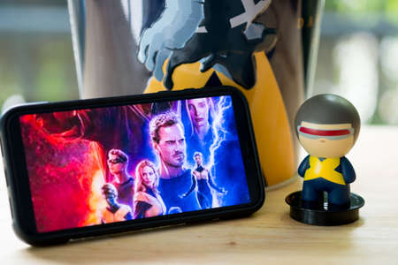 Bangkok,Thailand – June 30, 2019: Advertising for the movie called X-Men Dark Phoenix with toy model and bucket popcorn to promote the movie at Major Cineplex Group Plc. Operates the largest cinema in Thailand.
