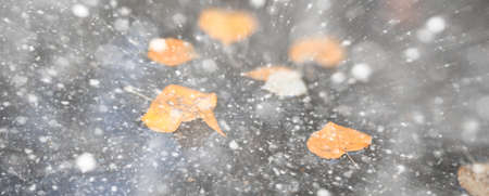 Autumn leaves on pavement with first snowfall, signaling the change from fall to winter AI