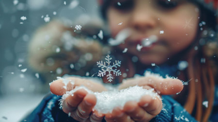 A child gazing in wonder at a single, perfect snowflake melting on their hand. Convey the preciousness and wonder of water in all its forms.