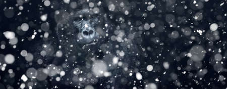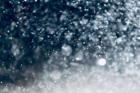 Snowstorm texture, bokeh lights on black background, shot of flying snowflakes in the air