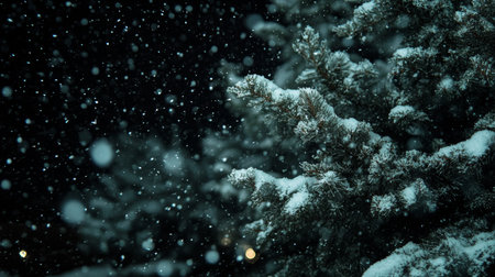 A captivating scene of snow falling gently over a dense evergreen forest at night, creating a tranquil and magical atmosphere perfect for winter-themed projects.
