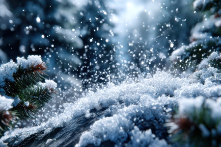 Photography captures snow-laden pine branches with frost, contrasted by a rich green background, evoking a tranquil winter atmosphere with copy space for text