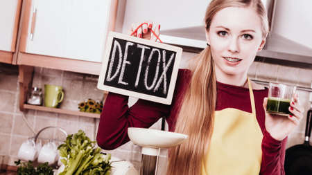Drinks good for health, diet breakfast concept. Young woman in kitchen holding green healthy vegetable smoothie juice glass next to detox sign.