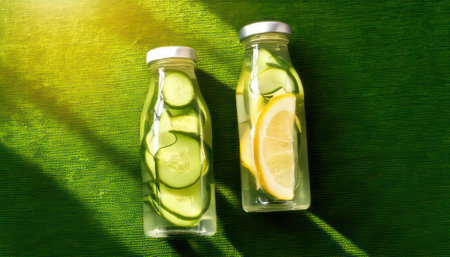 Detox water with lemon and cucumber in glass bottles on green background
