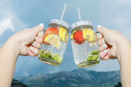 Woman hand with Fruit water with lemon and strawberries in a glass jar on nature background