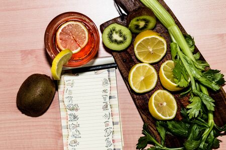 Cutting board with lemons, kiwi and celery and notebook of recipes