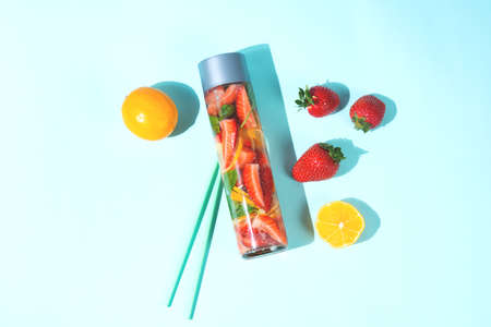 Infused water with strawberries, lemon and Basil in a glass bottle lies on a blue background with Trendy sunlight Summer. Detox water lies on a blue background with space for text. The view from the top. Flatley