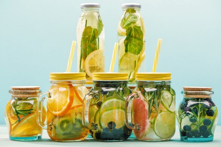 Infused detox water with orange, lemon and lime. Refreshing citrus lemonade in glass mason jar.