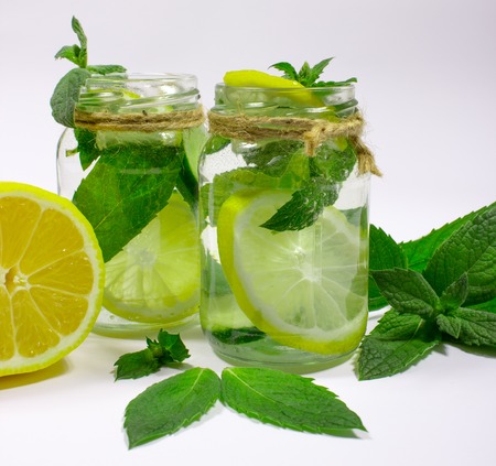 Water with lemon and peppermint in the glass on a bright background. Diet or weight loss concept