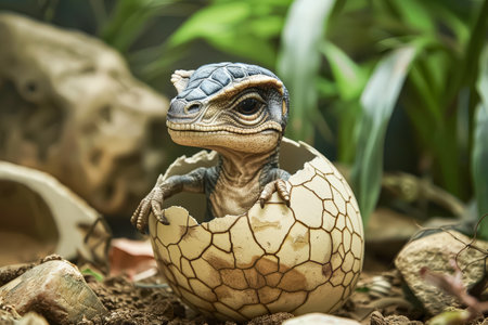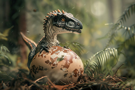 Baby Dinosaur Nesting out of an Egg. Dinosaur coming out of an egg shell illustration. Ai generated