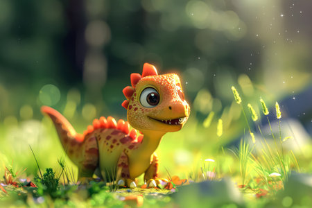 Small orange dinosaur is sitting on a mossy patch of grass in a forest. The dinosaur has a happy expression on its face, and the scene is peaceful and serene