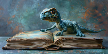 an open book from which a cute dinosaur emerges. Concept Dinosaur Photoshoot, Imaginative Props, Whimsical Portraits, Creative Poses