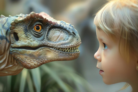 Young childs close encounter with a lifelike dinosaur exhibit, capturing her curiosity and wonder