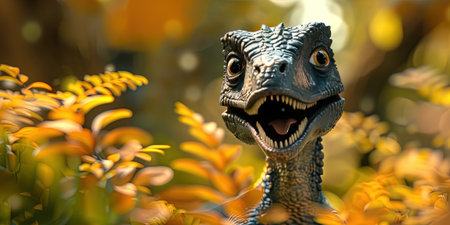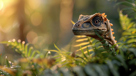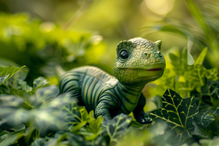 Charming toy dinosaur emerges amongst vibrant green foliage, evoking a magical, prehistoric garden scene