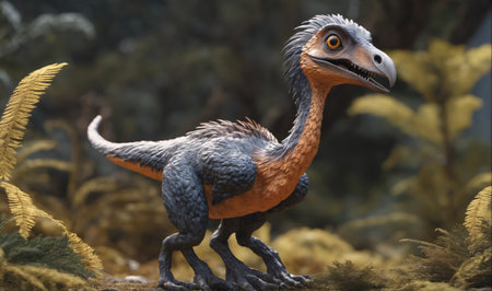 3D Oviraptor stealing eggs from nest, mischievous expression
