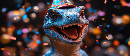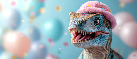 Partyready dinosaur with a pink hat, pastel blue background, colorful balloons and confetti