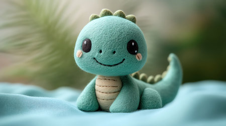 A small, green felt dinosaur toy with a simple stitched design, lying on a soft blue background