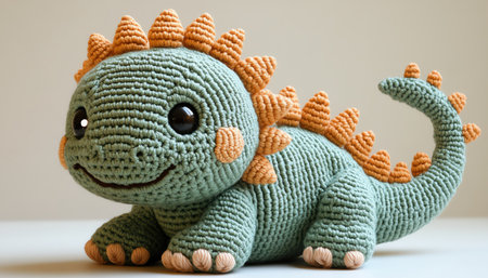 A green dinosaur made of plasticine, a childhood character. Space for text