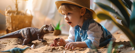 A child pretending to be an archaeologist, digging up the sandbox and finding toy dinosaur fossils