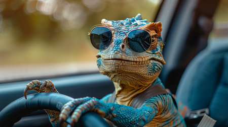 Dinosaur with orange sunglasses, blue background, whimsical and fun