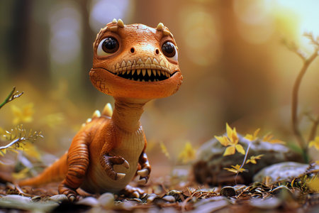 Small plastic dinosaur toy sits smiling amidst a dreamy, bokehlit natural environment