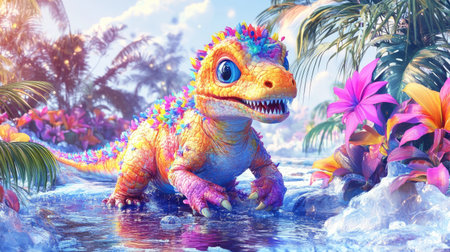 A vibrant cartoon dinosaur stands joyfully in a tropical paradise, surrounded by colorful flowers and lush greenery. The playful creature exudes charm in this enchanting scene.