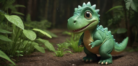 Cute green dinosaur in the forest. 3d rendering. Computer digital drawing.