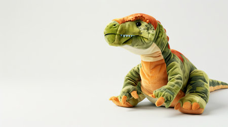 Colorful plush dinosaur toy on a white background. Concept of children's toy, playful gift, kids room decor. Copy space.