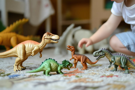 A child interacts with various dinosaur figures, showing imagination and playfulness in a bright room.