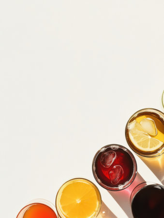 Various drinks like juice, tea, and soda displayed in glasses on a white surface, providing a clean backdrop for design or text additions.