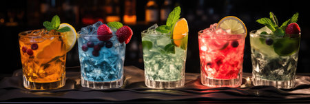 A closeup of icy, colorful rainbow cocktails lined up on a glossy bar counter, neon reflections, shallow depth of field