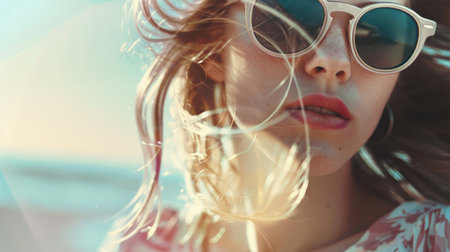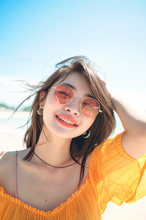 A young woman laughs joyfully wearing stylish sunglasses on a bright sunny day. Her long hair flows in the breeze against a clear blue sky filled with fluffy clouds.