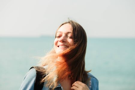 Young woman on a background of the sky. Hair blows in the wind. Red-haired girl on the coast. Joyful girl.
