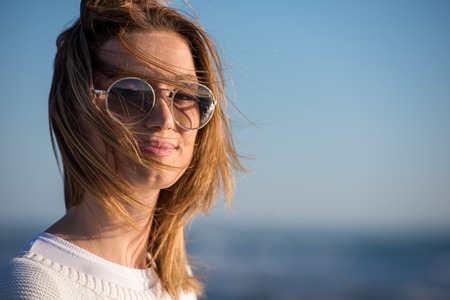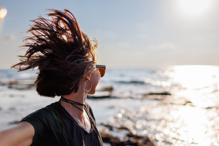 Close-up of a stunning woman with hair blowing in the wind taking a selfie by the sea. Beautiful girl smiling while looking at camera outside - fashionable lifestyle and beauty concept