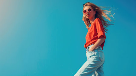 A striking portrait of a young woman wearing an orange beanie and stylish sunglasses, exuding confidence and joy against a vibrant blue sky.
