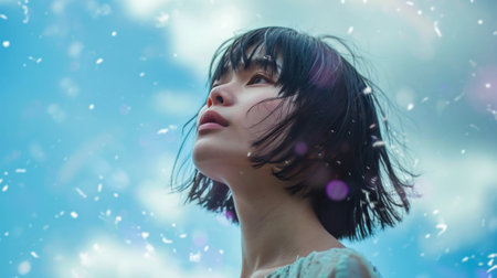 A woman looking up, her hair blowing in the wind against a blue sky, portraying freedom, thoughtfulness, or aspiration