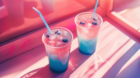 Aesthetic bubble tea, bright pink and blue colors. Beverage with tapioca bubbles. The trendy cafe. Summer vibes. Generative AI.