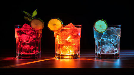 Three colorful cocktails with ice cubes and straws on the bar counter in a nightclub, with a dark background and blurred lights. Close-up of three glasses of cocktail drinks at a nightclub party. Copy space available. High quality. Photographed with a Sony Alpha A7R IV, wide-angle shot. --chaos 30 --ar 16:9 --v 6.1 Job ID: d6735f78-68c8-4de3-abd6-12c8cbaa5bea