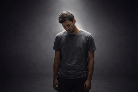 Portrait of depressed young man in gray t-shirt standing alone in dark room looking down. Generative AI