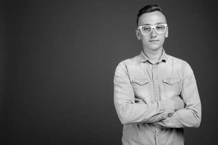 Caucasian man in glasses looking up and standing with folded arms on gray background. Monochrome portrait of pondered or dreamed male with copy space. Thinking concept.