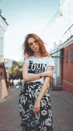 Young beautiful woman in sunglasses walking along a street in a city in the fresh air.