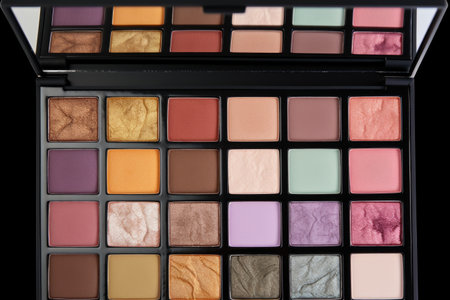 Cosmetics palette closeup with different colors, flatlay, Generative AI