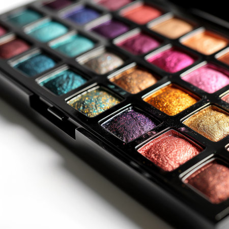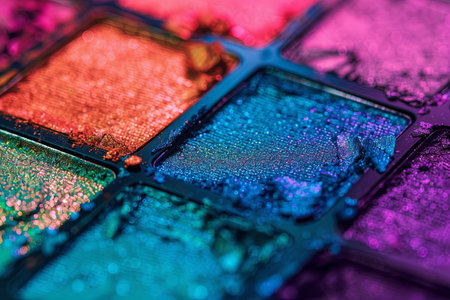 Detailed close-up of a vibrant eyeshadow palette with rich hues and visible texture.