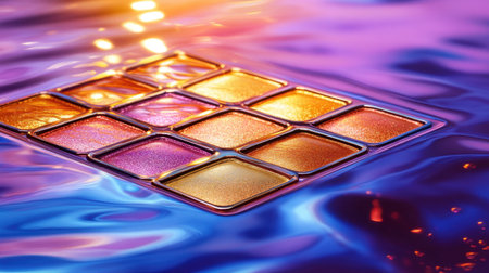 A stunning eye shadow palette floats gracefully on a tranquil water surface, illuminated by soft light reflections. The vibrant colors and shimmering textures create a captivating visual experience perfect for beauty enthusiasts.