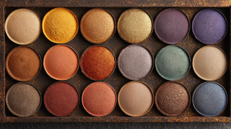 A high-detail close-up capturing the rich and varied hues of a multi-colored eyeshadow palette with a perfectly even surface texture.