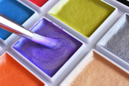 A close up image of a brightly colored set of water color paints with paint brushes.